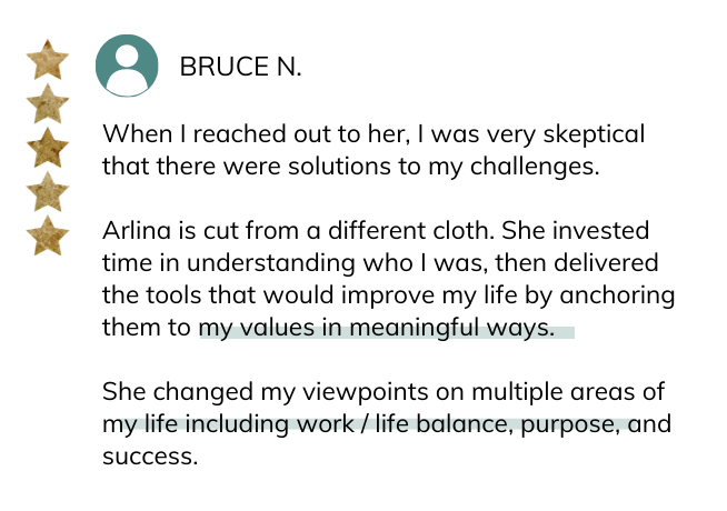 I am happy to say that I have not had a drink for over 5 months nor do I have the desire to. I trusted Arlina from the first meeting. She was confident and comforting at the same time. She helped me sort through some complicated family issues that I had never really addressed before. She held me accountable in a way that didn't overwhelm me.